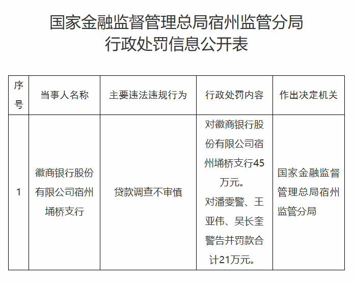 【大河财立方消息】12月16日,国家金融监督管理总局宿州监管分局披露的行政处罚信息公开表显示,因贷款调查不审慎四川炒股配资,徽商银行股份有限公司宿州埇桥支行被罚45万元。